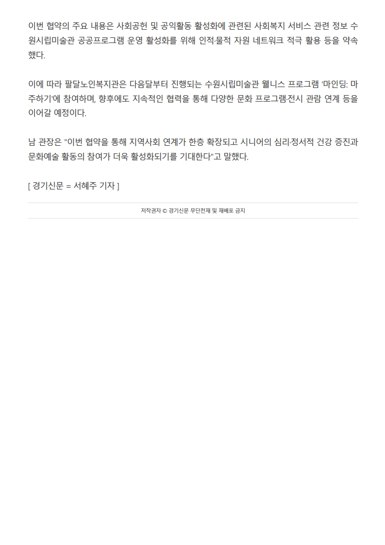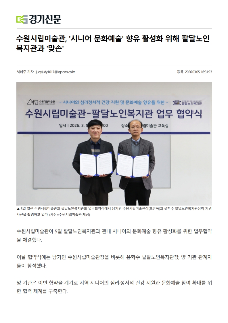 [2026-03-05][경기신문]수원시립미술관, 시니어 문화예술 향유 활성화 위해 팔달노인복지관과 맞손